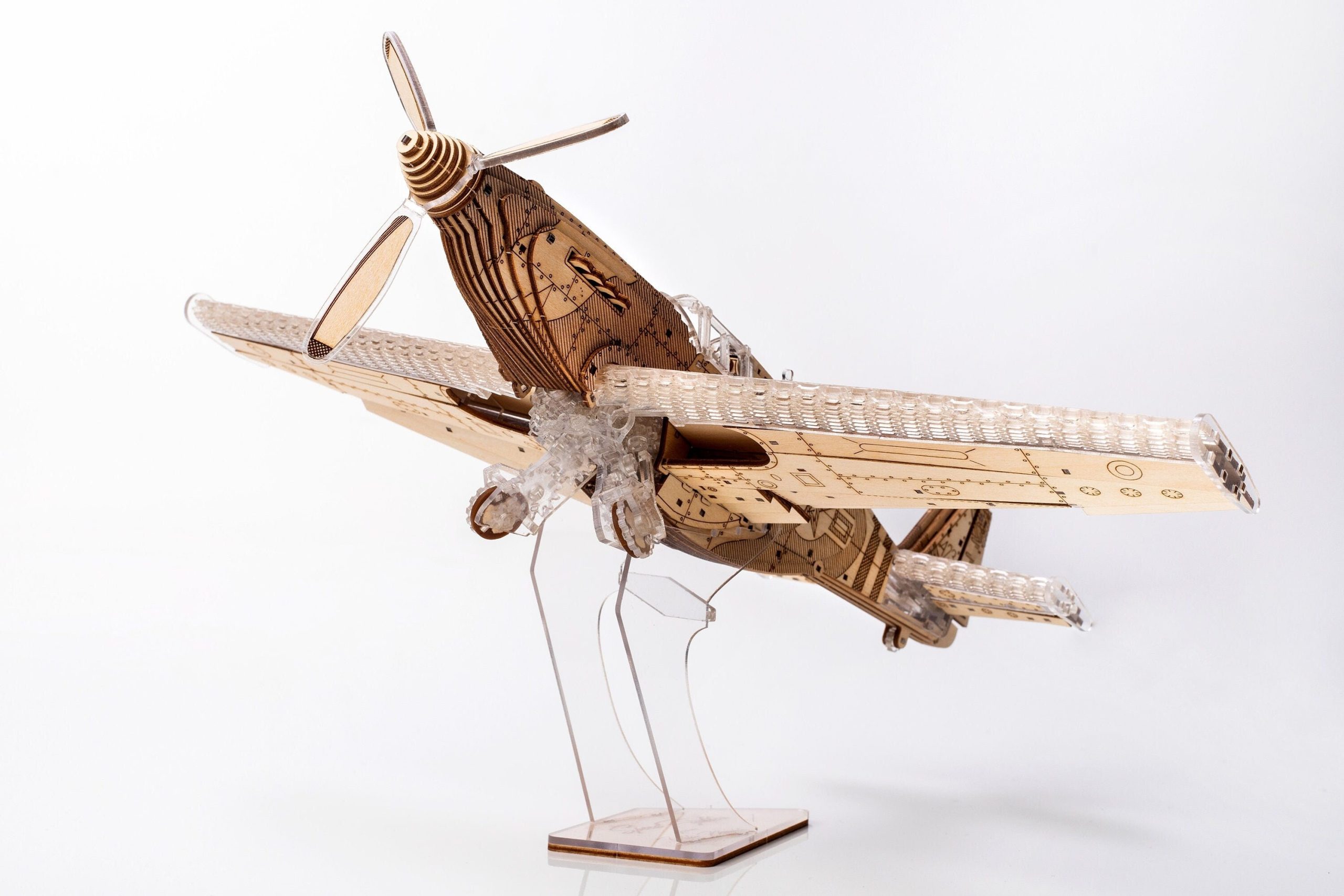 Challenging mechanical 3D puzzle featuring a functional airplane model with a working engine, control surfaces, and retractable landing gear. Advanced assembly for ages 14+.